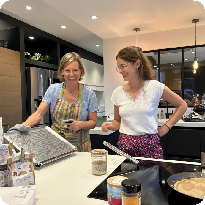 C'est Brigitte qui a transmis à Camille le goût de la cuisine santé. Dès le secondaire, Camille préparait ses lunchbox avec l'aide de sa maman. Aujourd'hui, on allie nos deux expertises : Brigitte, l'experte du quotidien (20 ans à nourrir 5 personnes, ça forge !) et Camille, l'experte de la théorie (elle sait expliquer le pourquoi derrière chaque assiette).